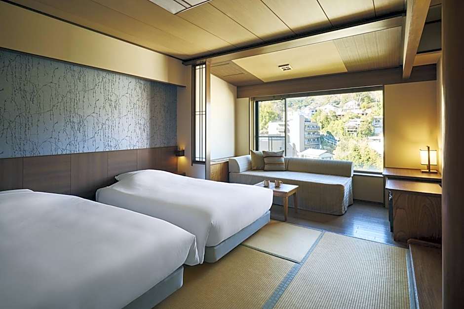 The twin room includes a shared bathroom equipped with a bidet, a hairdryer and slippers. The air-conditioned twin room provides a flat-screen TV, tatami, a seating area, a safe deposit box as well as mountain views. The unit offers 2 futon beds.